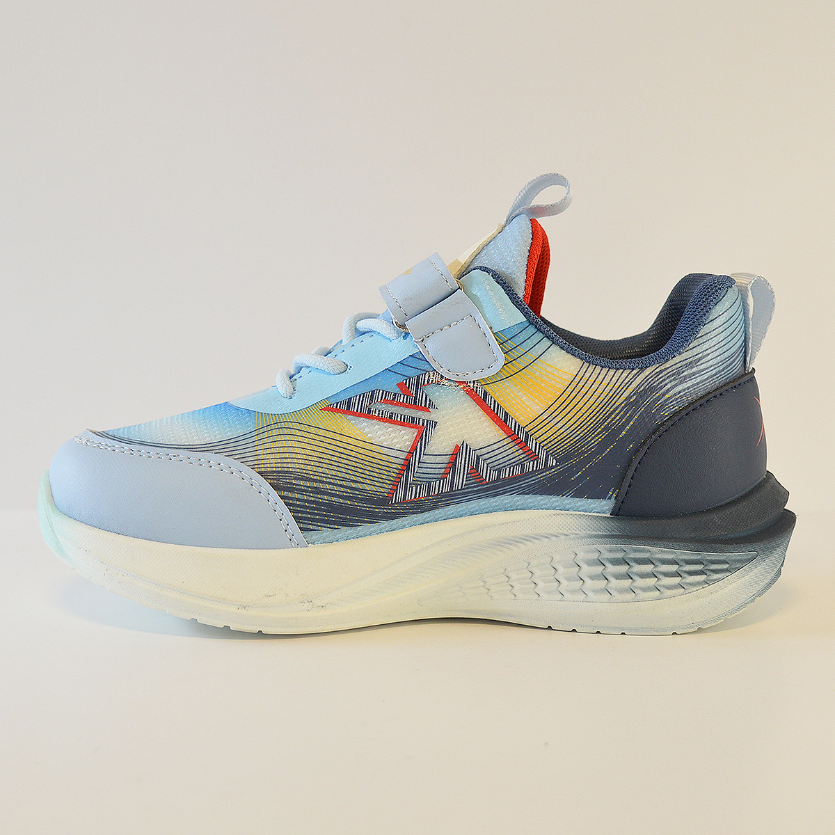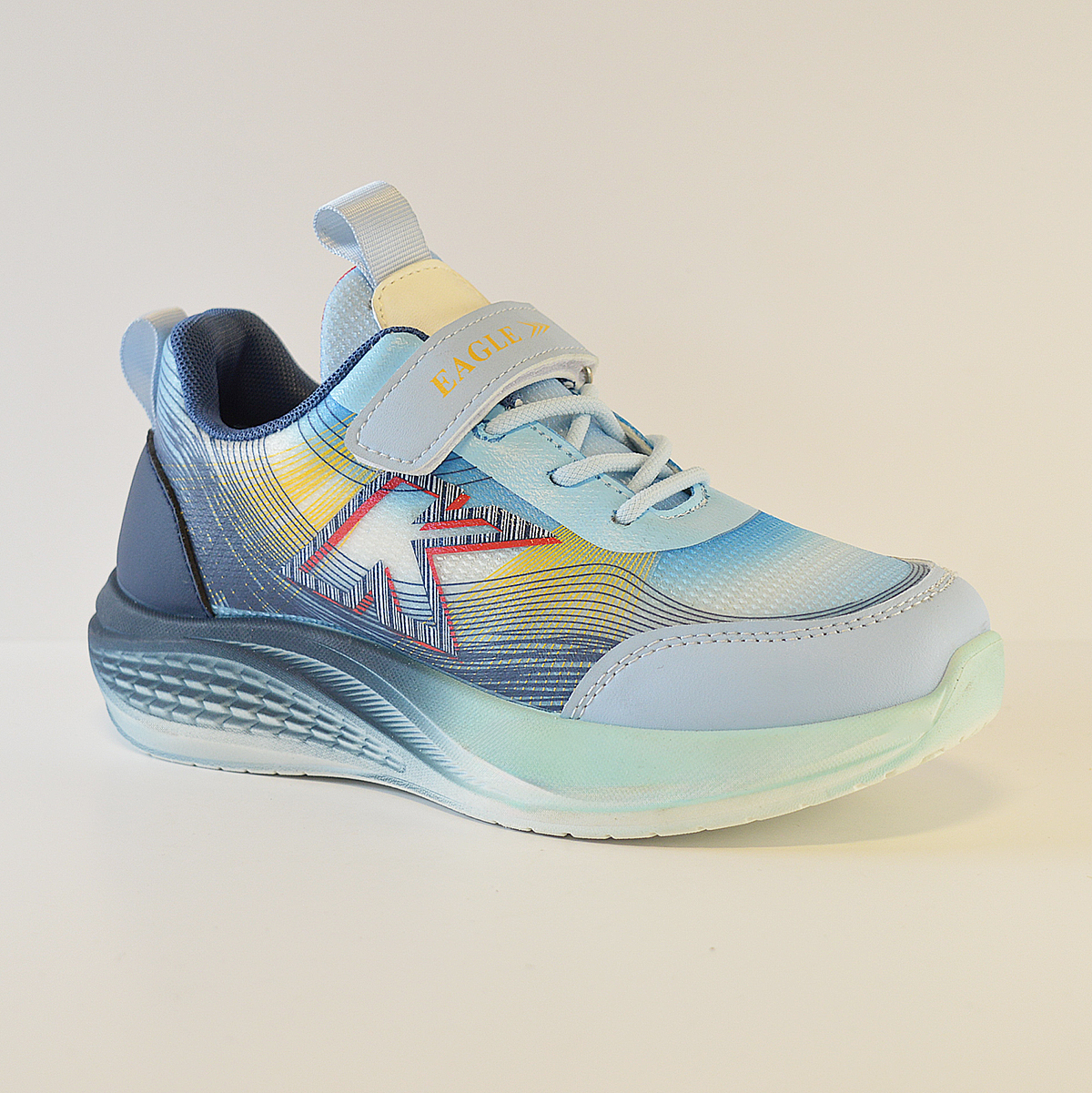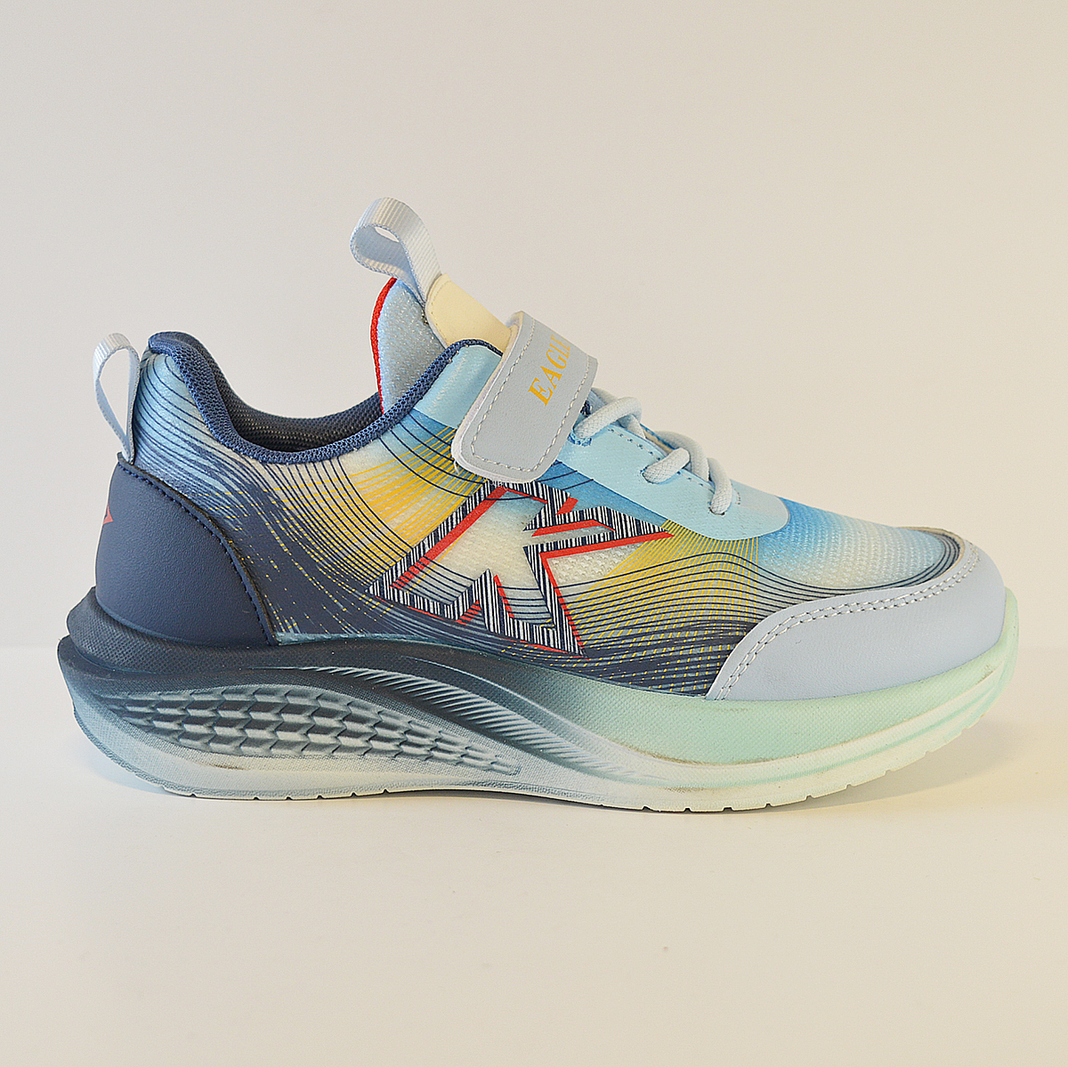 Zapatillas Kids Eagle E8119 destaca su diseño moderno, colorido y deportivo, cuenta con cierre combinado de cordones elásticos y tira de velcro.