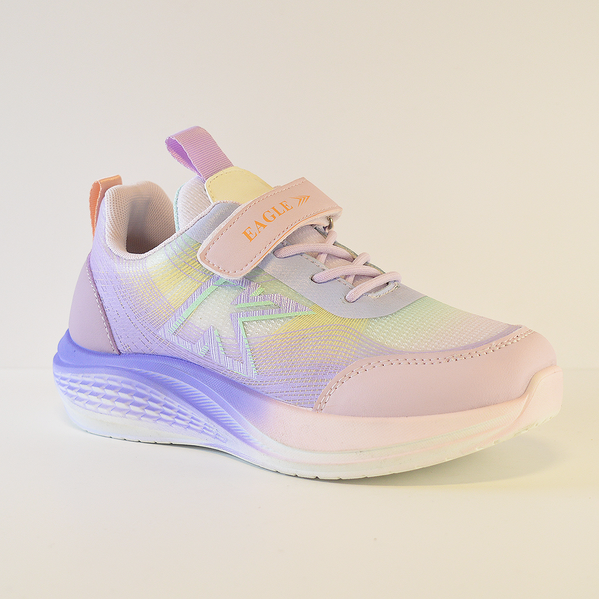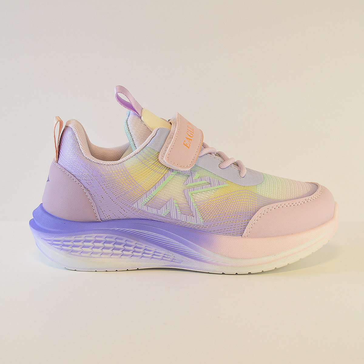 Zapatillas Kids Eagle E8119 destaca su diseño moderno, colorido y deportivo, cuenta con cierre combinado de cordones elásticos y tira de velcro.